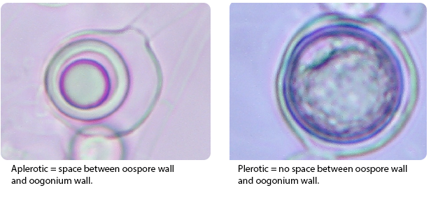 Left: Aplerotic have space between oospore wall and oogonium wall Right: Plerotic has no space between oospore wall and oogonium wall.