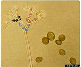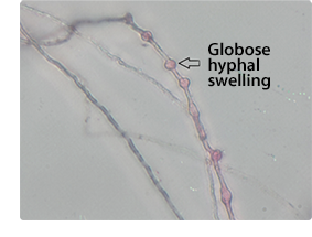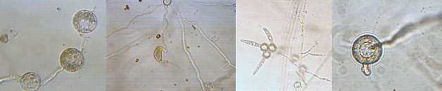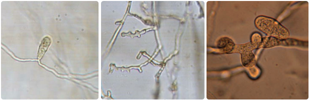Left: Inflated, filamentous sporangium = wider than hyphae. Right: Slightly inflated, filamentous sporangium.