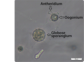 Left: Spherical sporangium, intercallery oogonium, and an antheridum. Right: Slightly irregular oogonium shape with antheridum.